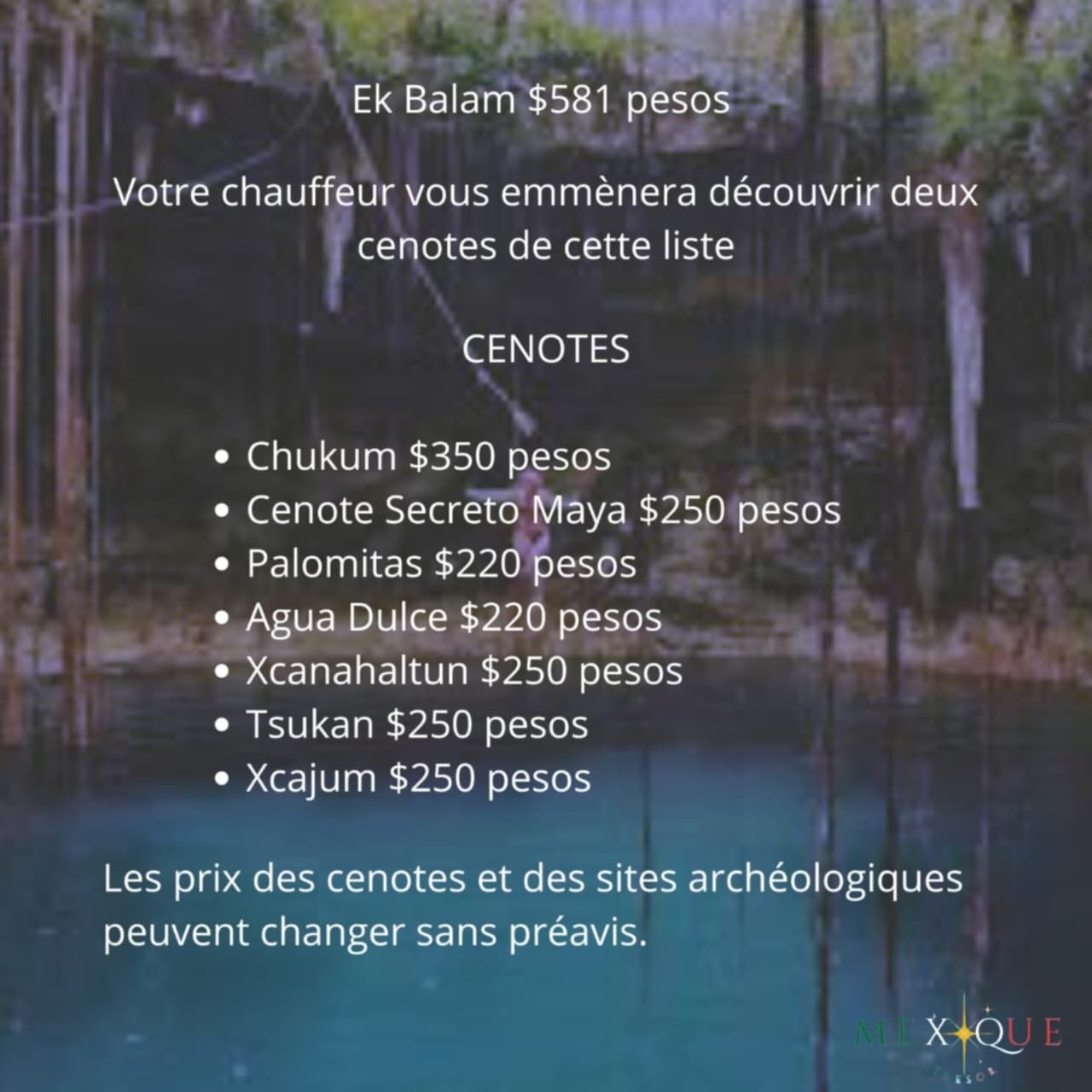 Les prix des cenotes et des sites archéologiques peuvent changer sans préavis.